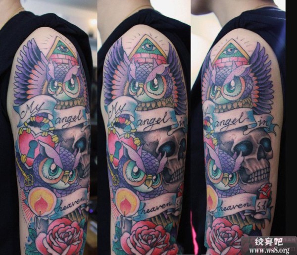 创意花臂猫头鹰玫瑰maotouyingmeigui_玫瑰花纹身图案大全_纹身图吧