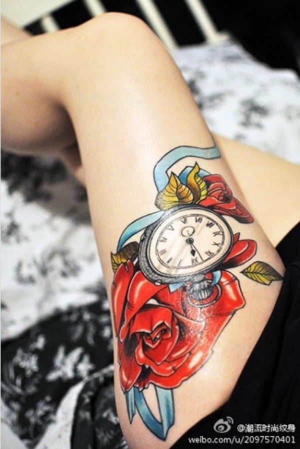 女生腿部玫瑰时钟纹身图案图片_玫瑰花纹身图案大全_纹身图吧