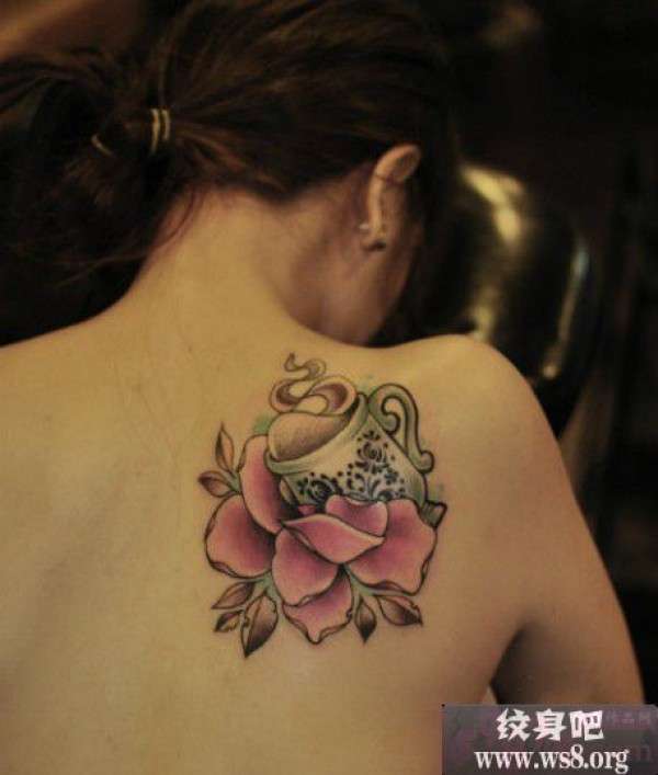 经典咖啡杯玫瑰肩部纹身图案_玫瑰花纹身图案大全_纹身图吧