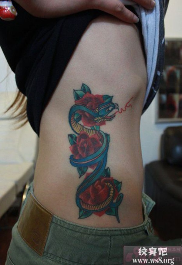 蛇缠绕玫瑰小蛮腰纹身图案_玫瑰花纹身图案大全_纹身图吧