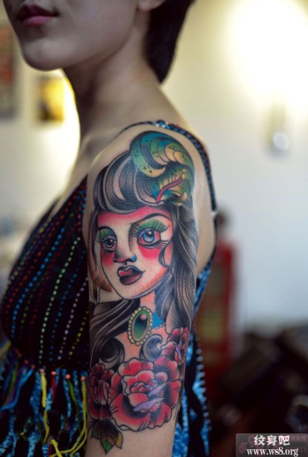 花臂姑娘头像玫瑰纹身图案_玫瑰花纹身图案大全_纹身图吧