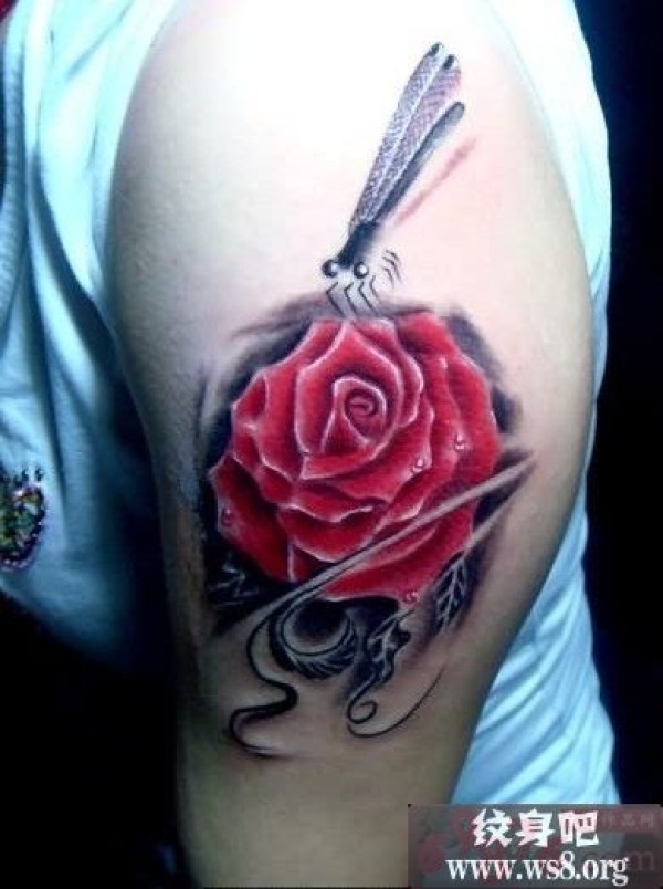 手臂玫瑰与蜻蜓纹身图案_玫瑰花纹身图案大全_纹身图吧