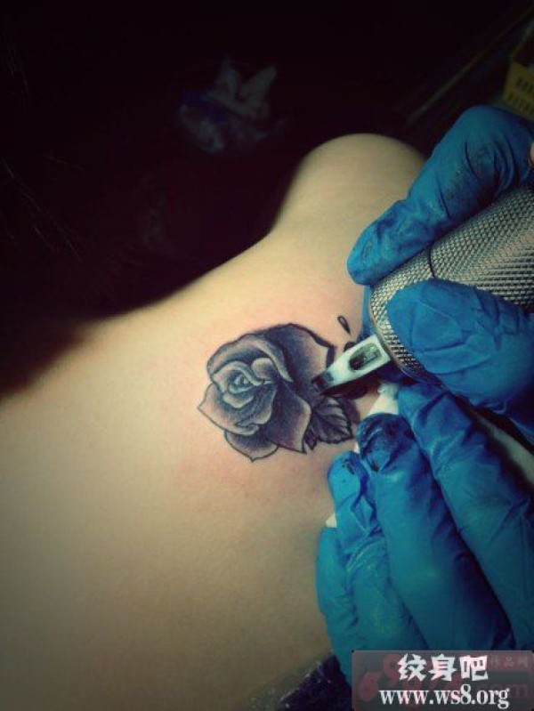 女生个性后颈黑白玫瑰唯美纹身_玫瑰花纹身图案大全_纹身图吧