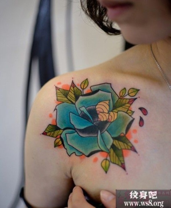 肩部蓝色玫瑰花纹身图案_玫瑰花纹身图案大全_纹身图吧