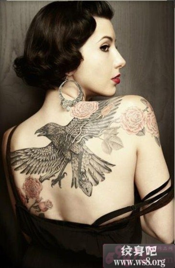 女人后背性感老鹰玫瑰刺青图案_玫瑰花纹身图案大全_纹身图吧
