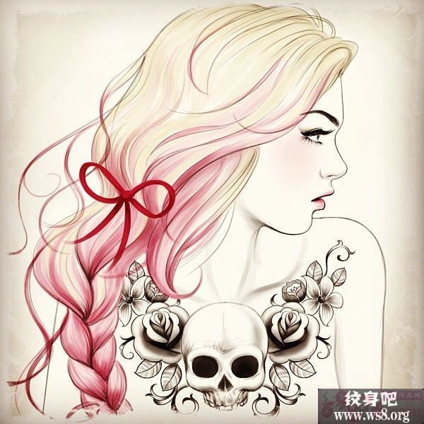 动漫美女胸前骷髅与玫瑰刺青图案_玫瑰花纹身图案大全_纹身图吧