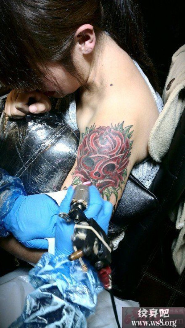 女生手臂个性玫瑰骷髅刺青过程图案_玫瑰花纹身图案大全_纹身图吧