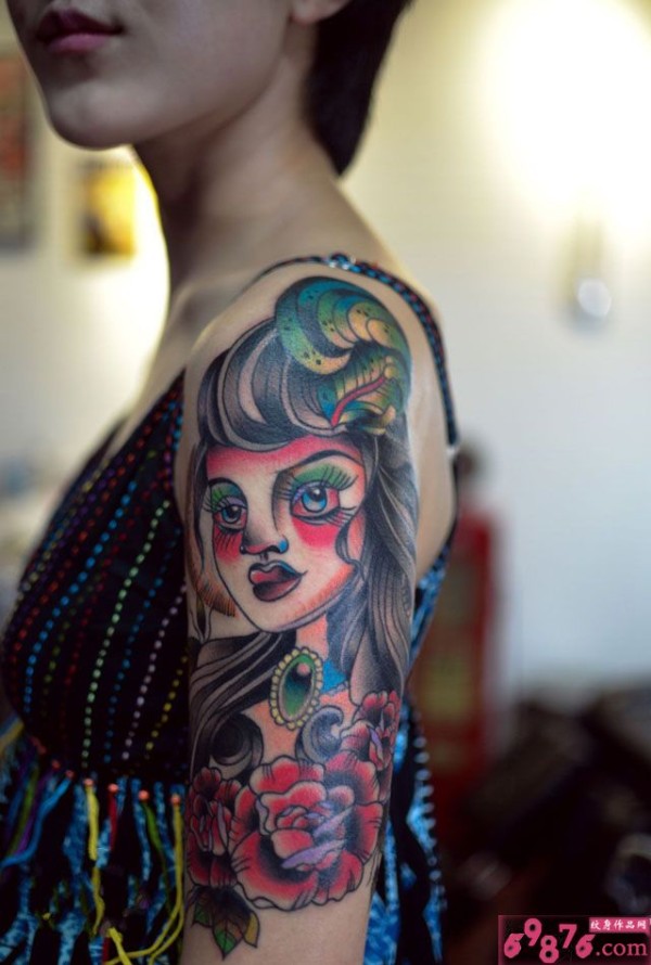 花臂姑娘头像玫瑰纹身_玫瑰花纹身图案大全_纹身图吧