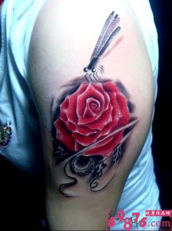 手臂玫瑰与蜻蜓纹身_玫瑰花纹身图案大全_纹身图吧