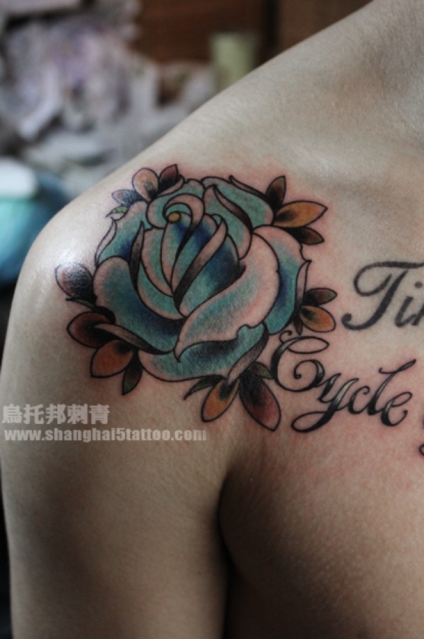 耳后蓝色妖姬玫瑰纹身_玫瑰花纹身图案大全_纹身图吧
