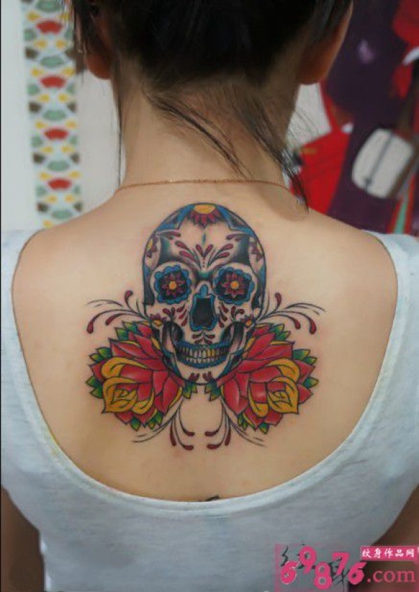 彩色骷髅玫瑰背部纹身_玫瑰花纹身图案大全_纹身图吧