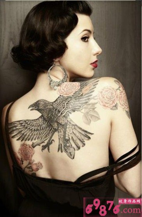 女人后背性感老鹰玫瑰刺青_玫瑰花纹身图案大全_纹身图吧