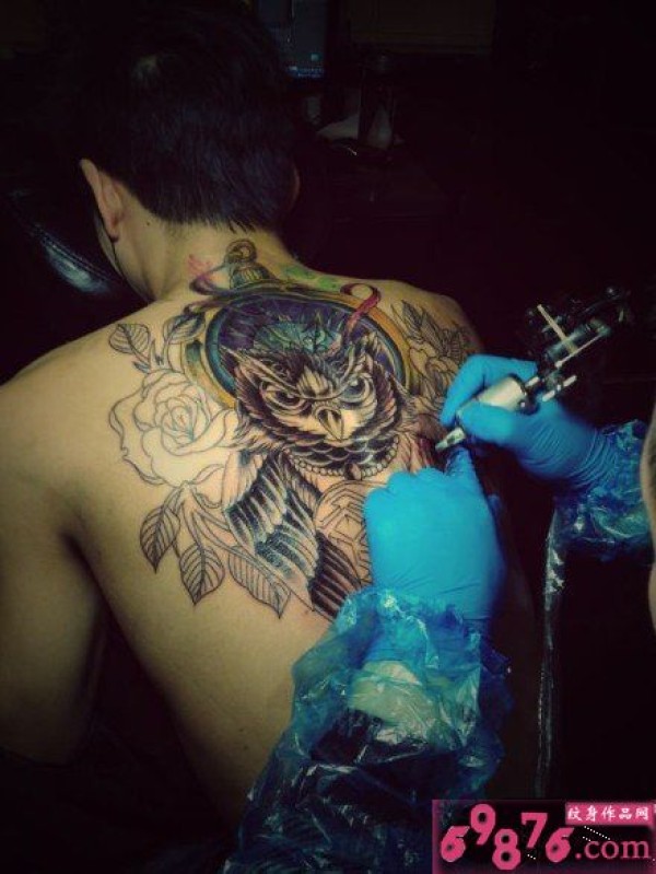 后背猫头鹰玫瑰纹身过程_玫瑰花纹身图案大全_纹身图吧