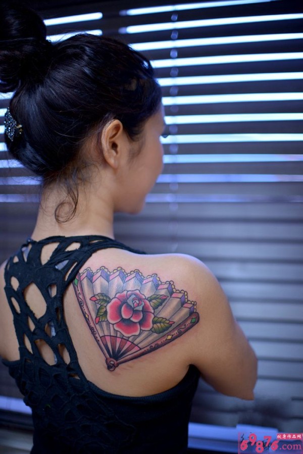 玫瑰扇子女生肩部纹身_玫瑰花纹身图案大全_纹身图吧
