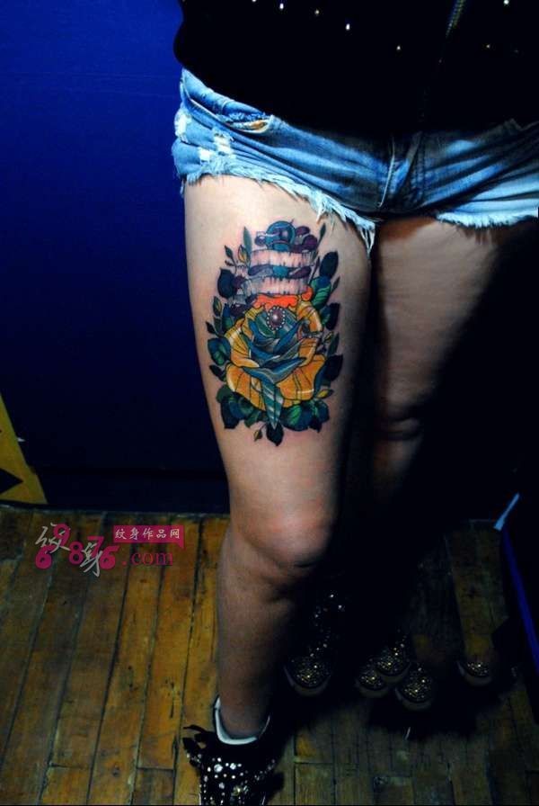 欧美剑刺玫瑰大腿纹身_玫瑰花纹身图案大全_纹身图吧