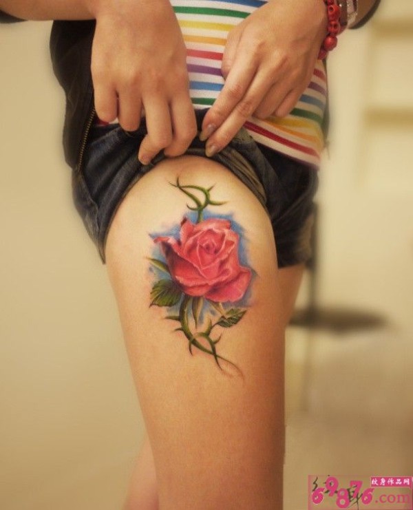 大腿粉色玫瑰刺青_玫瑰花纹身图案大全_纹身图吧