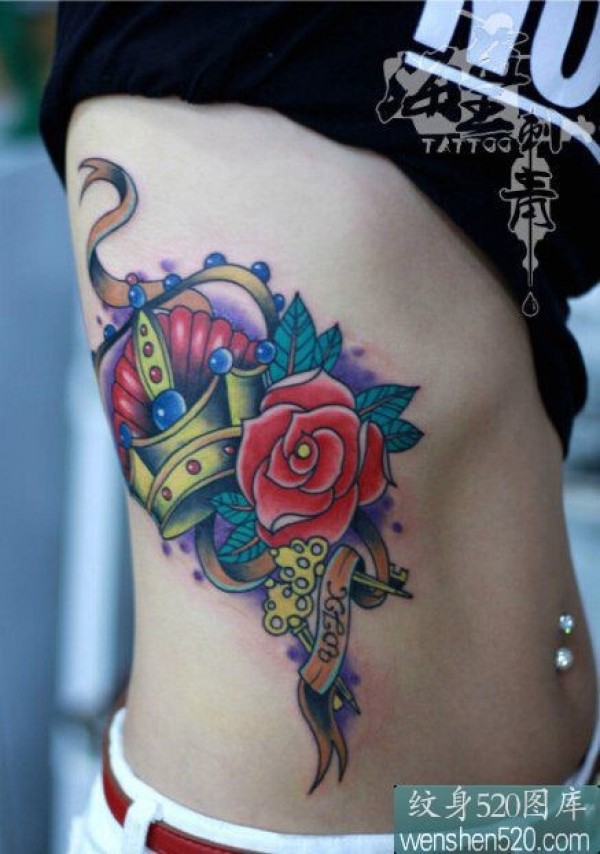 侧腰彩色玫瑰花皇冠纹身图案_玫瑰花纹身图案大全_纹身图吧