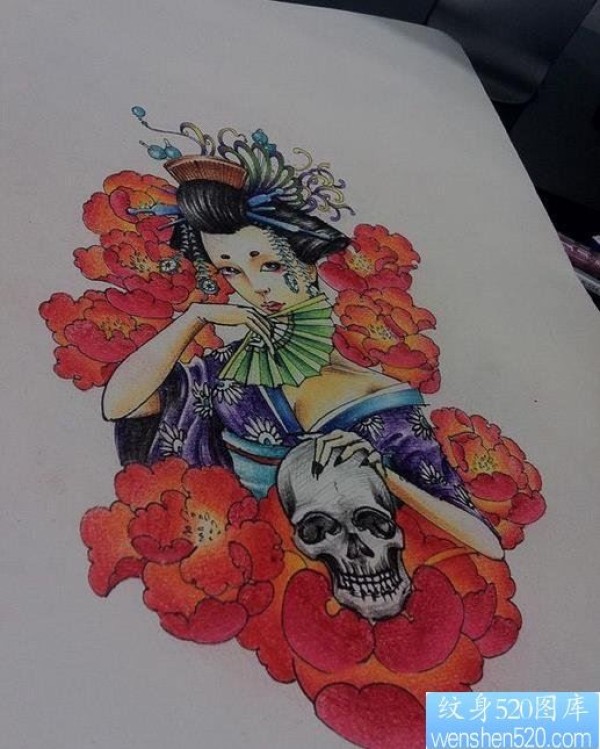 艺妓骷髅玫瑰花纹身图案_玫瑰花纹身图案大全_纹身图吧