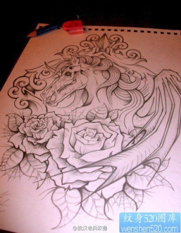 一款线条的马玫瑰花纹身图案_玫瑰花纹身图案大全_纹身图吧