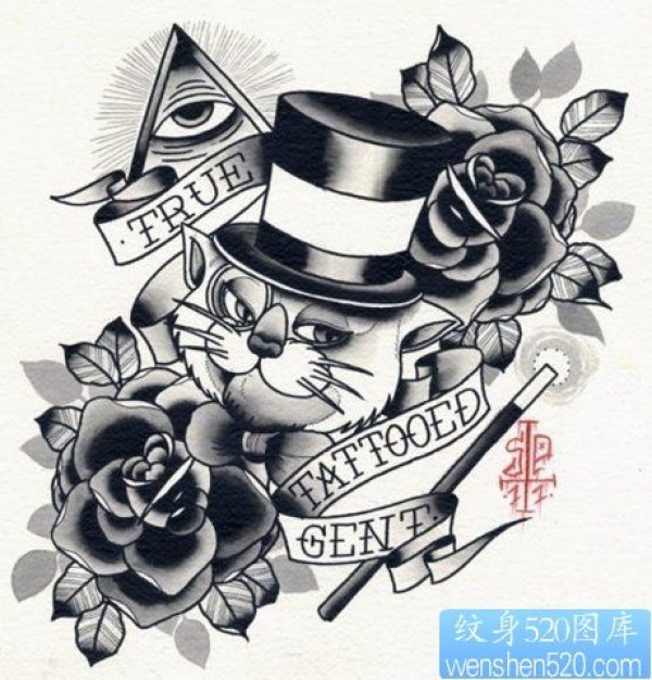 一款猫玫瑰线稿纹身图案_玫瑰花纹身图案大全_纹身图吧
