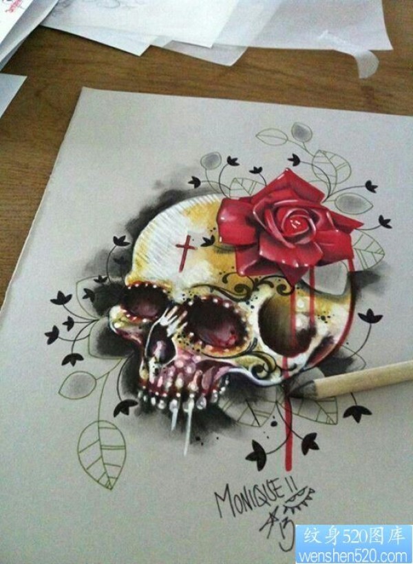 欧美彩色骷髅玫瑰纹身图案_玫瑰花纹身图案大全_纹身图吧