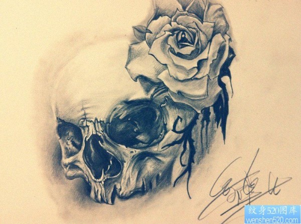 个性欧美玫瑰花骷髅头纹身图案_玫瑰花纹身图案大全_纹身图吧