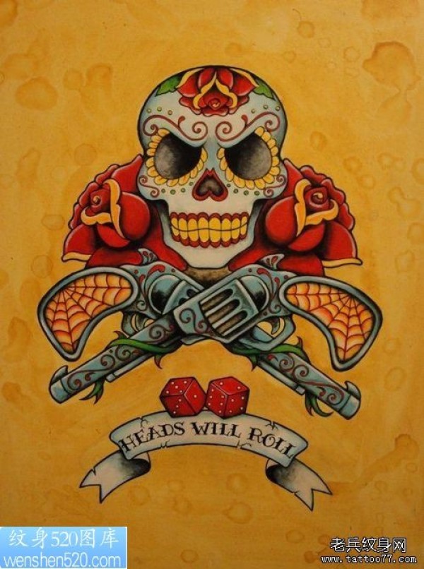 个性骷髅头手枪玫瑰花纹身作品_玫瑰花纹身图案大全_纹身图吧