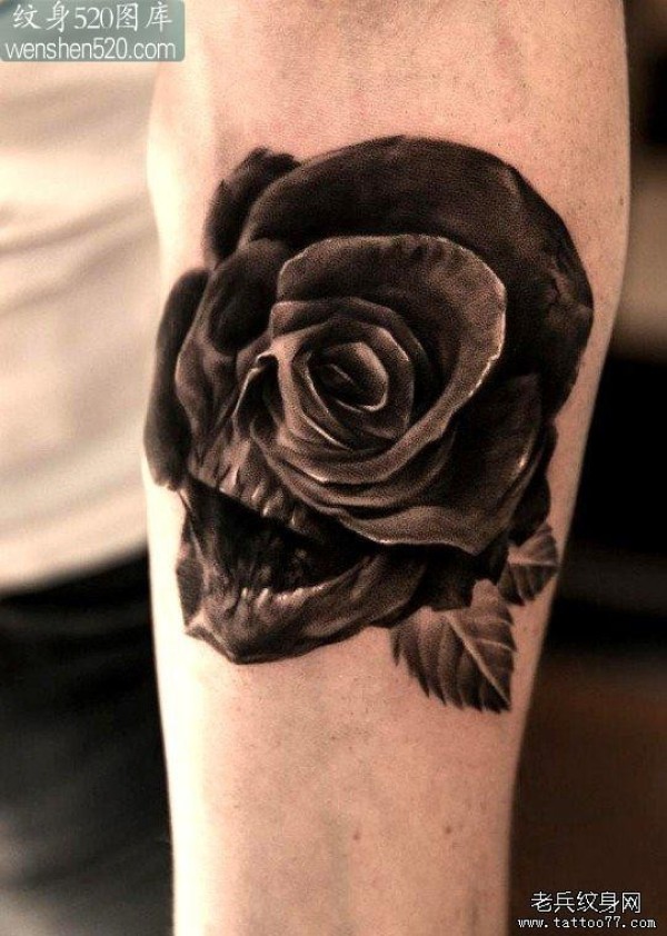 小臂上一张怪异的玫瑰花骷髅纹身作品_玫瑰花纹身图案大全_纹身图吧