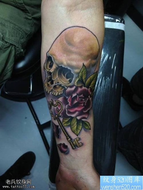 手臂骷髅玫瑰花钥匙纹身图案_玫瑰花纹身图案大全_纹身图吧