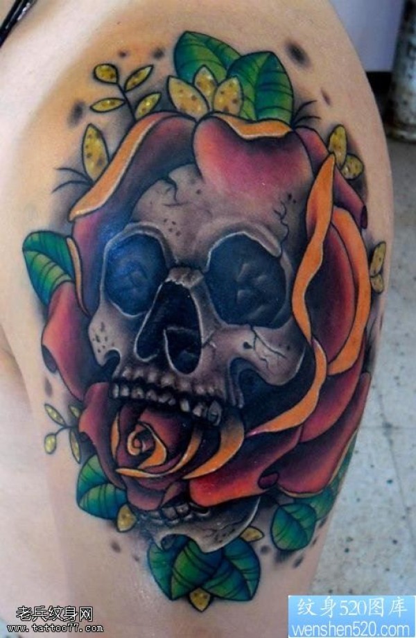手臂彩色欧美骷髅玫瑰花纹身图案_玫瑰花纹身图案大全_纹身图吧