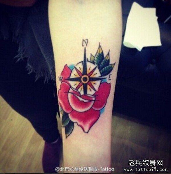 一款手臂彩色玫瑰花指南针纹身图案_玫瑰花纹身图案大全_纹身图吧