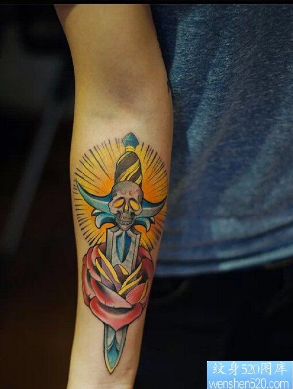 一款手臂彩色骷髅剑穿玫瑰纹身图案_玫瑰花纹身图案大全_纹身图吧