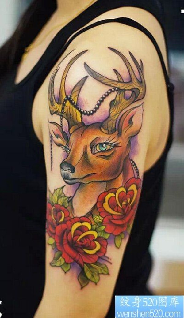 女性手臂鹿与玫瑰纹身图案_玫瑰花纹身图案大全_纹身图吧