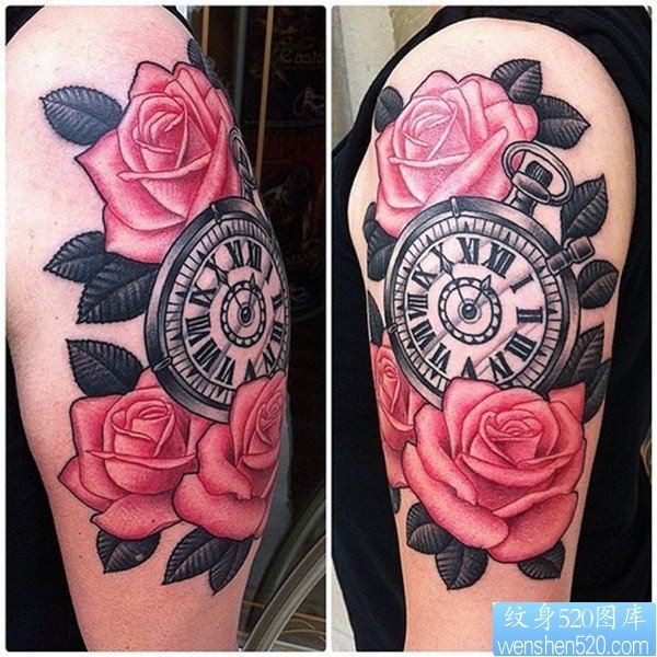 一款手臂时钟玫瑰花纹身图案_玫瑰花纹身图案大全_纹身图吧
