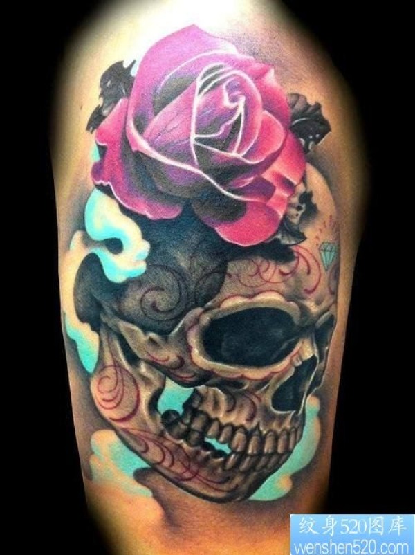 手臂彩色欧美骷髅头玫瑰花纹身图案_玫瑰花纹身图案大全_纹身图吧