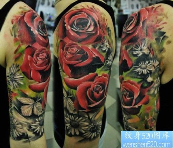 一幅胳膊彩色玫瑰花纹身作品_玫瑰花纹身图案大全_纹身图吧