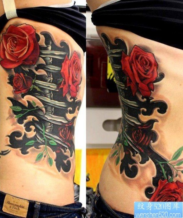 吗美女侧腰上一幅漂亮的玫瑰花机械纹身图片_玫瑰花纹身图案大全_纹身图吧