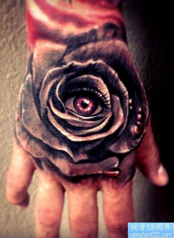手背上的一幅恐怖玫瑰花纹身图片_玫瑰花纹身图案大全_纹身图吧