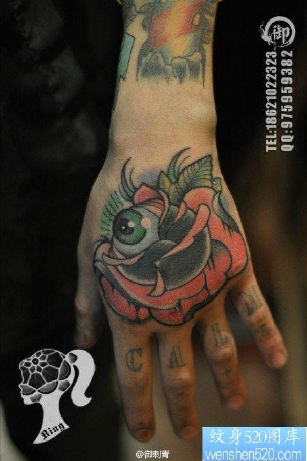 手背时尚潮流的玫瑰花眼睛纹身图片_玫瑰花纹身图案大全_纹身图吧