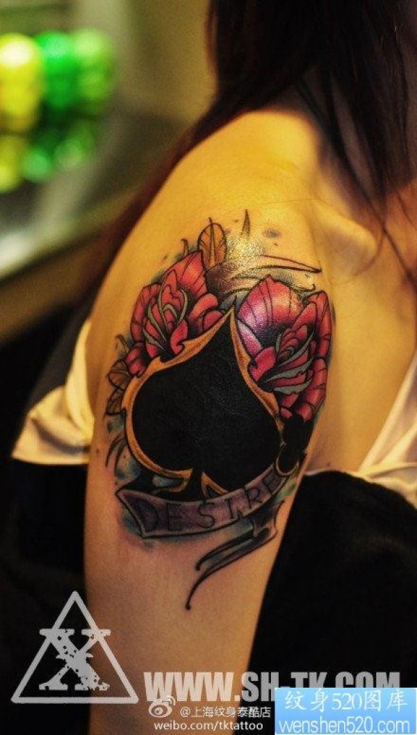 手臂漂亮的new school黑桃与玫瑰花纹身图片_玫瑰花纹身图案大全_纹身图吧