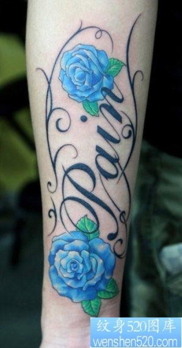 手臂一幅彩色玫瑰花与字母纹身图片_玫瑰花纹身图案大全_纹身图吧