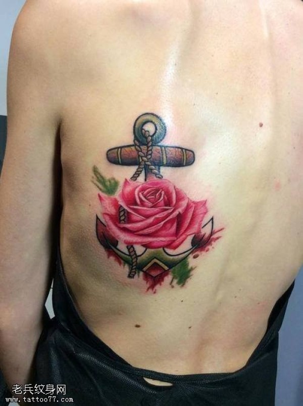 女性背部彩色船锚玫瑰花纹身图片_玫瑰花纹身图案大全_纹身图吧