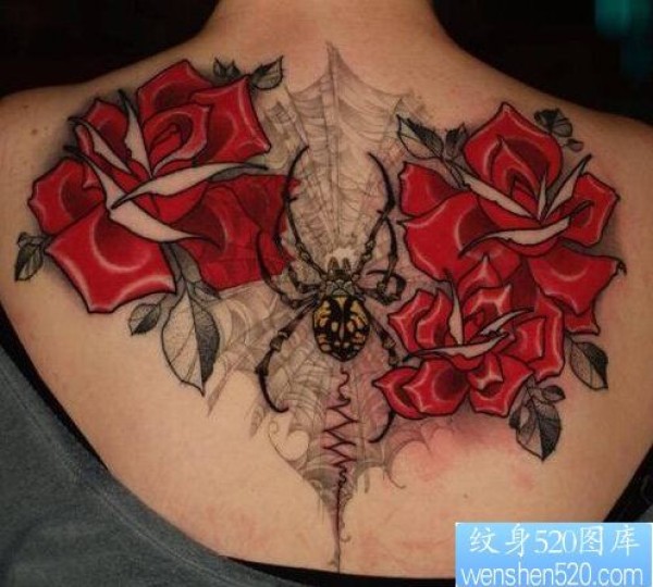 女性背部玫瑰花蜘蛛纹身图案_玫瑰花纹身图案大全_纹身图吧