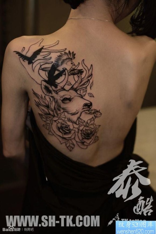背部独角兽大雁玫瑰花纹身图片_玫瑰花纹身图案大全_纹身图吧
