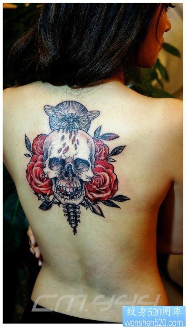 女人后背潮流时尚的玫瑰与骷髅纹身图片_玫瑰花纹身图案大全_纹身图吧