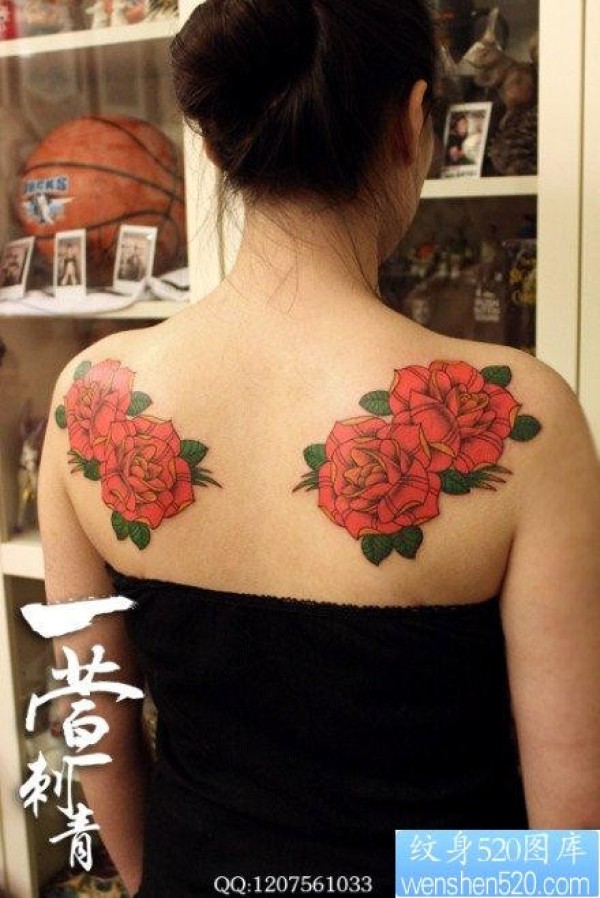 女人后背漂亮精美的玫瑰花纹身图片_玫瑰花纹身图案大全_纹身图吧