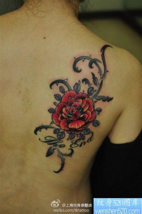 女人背部漂亮的彩色玫瑰花纹身图片_玫瑰花纹身图案大全_纹身图吧