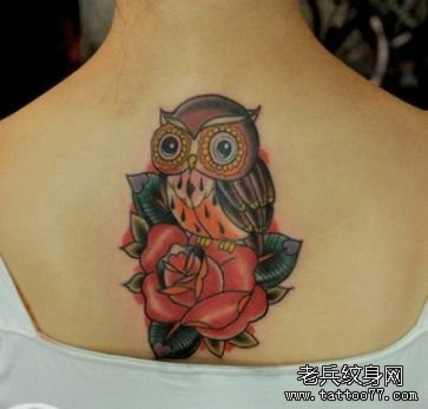 女孩子背部欧美风格猫头鹰与玫瑰花纹身图片_玫瑰花纹身图案大全_纹身图吧