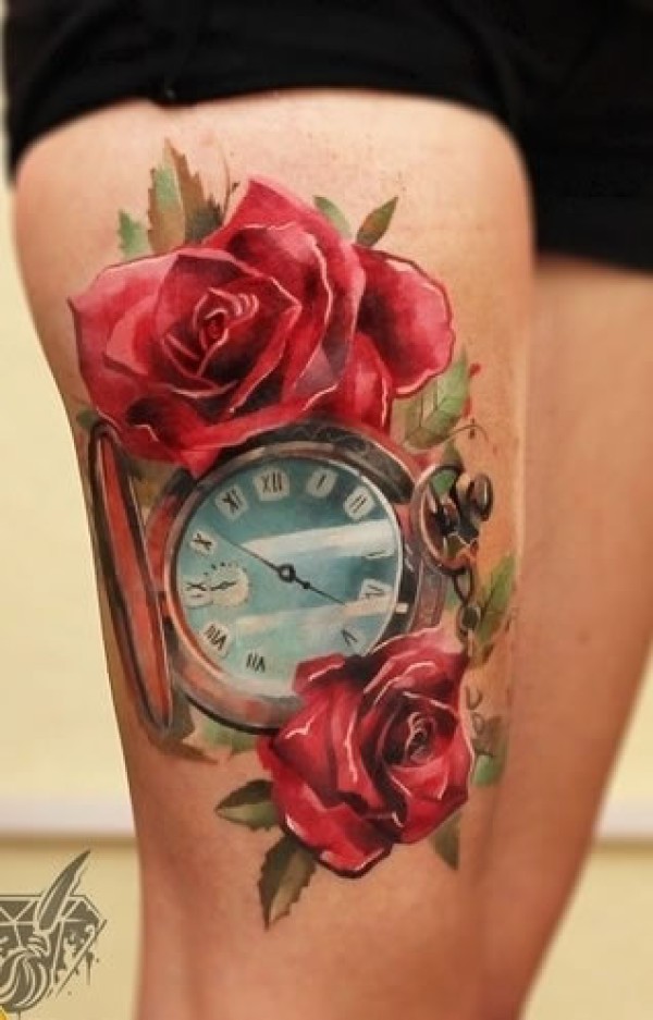 修长大腿上的欧美主题彩色纹身图案鲜艳的玫瑰_玫瑰花纹身图案大全_纹身图吧