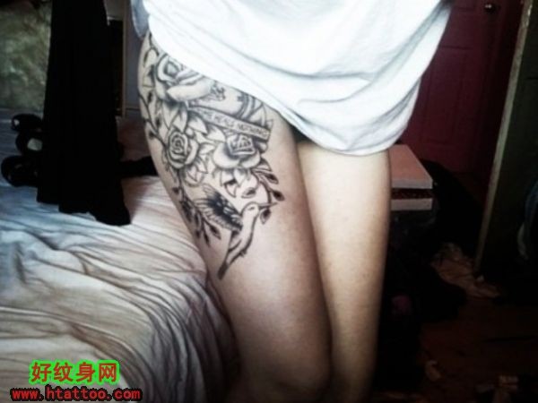 女生腿部黑白玫瑰花欧美另类纹身_玫瑰花纹身图案大全_纹身图吧